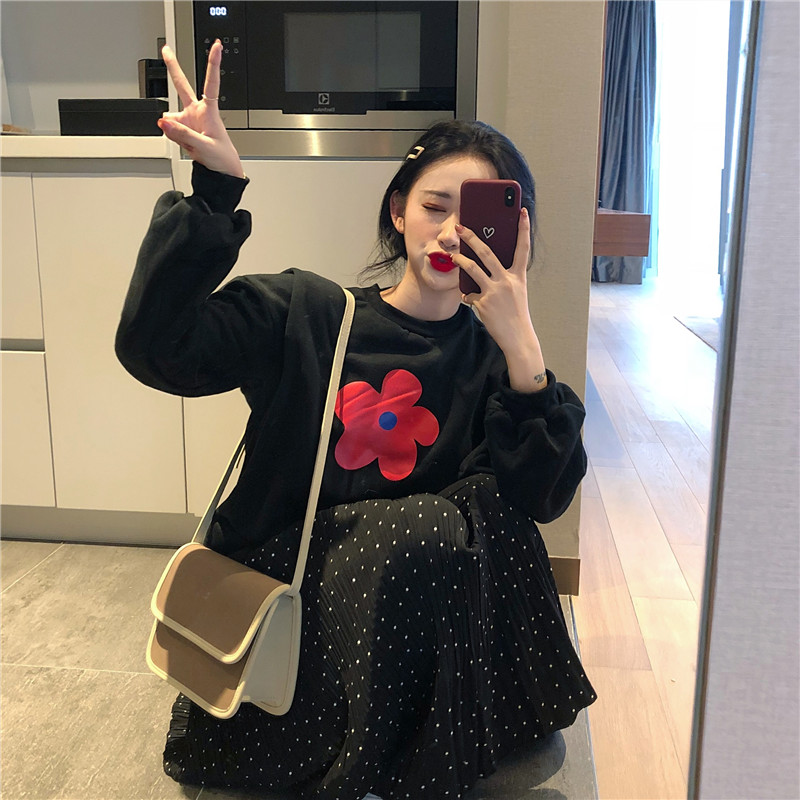 / 秋裝女2018新款套裝復古印花加絨衛衣女+百褶波點半身長裙兩件套
