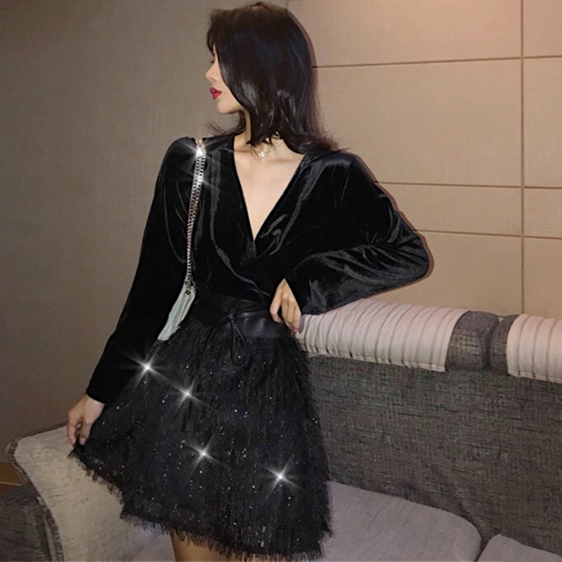 / 氣質絲絨時尚長袖連衣短裙子女秋冬裝新款法式流蘇收腰egg小黑裙