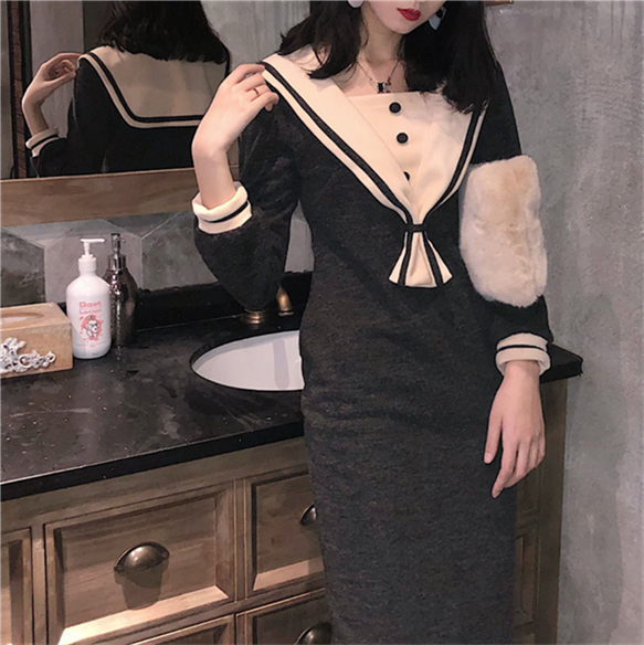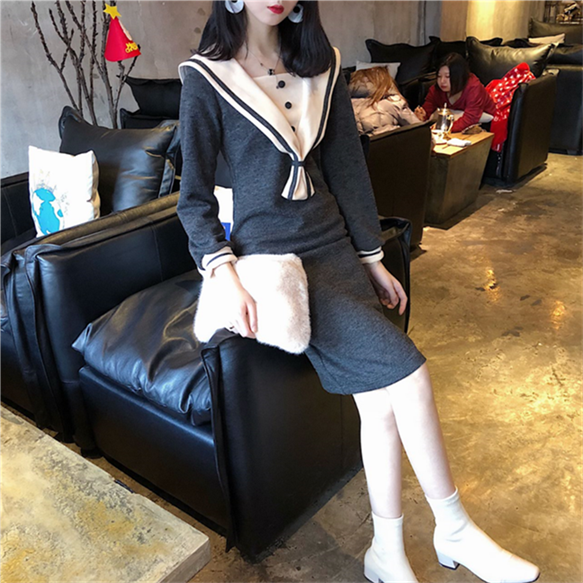 chic早秋裙子長裙女慵懶風秋裝女2018新款時尚水手服打底連衣裙潮