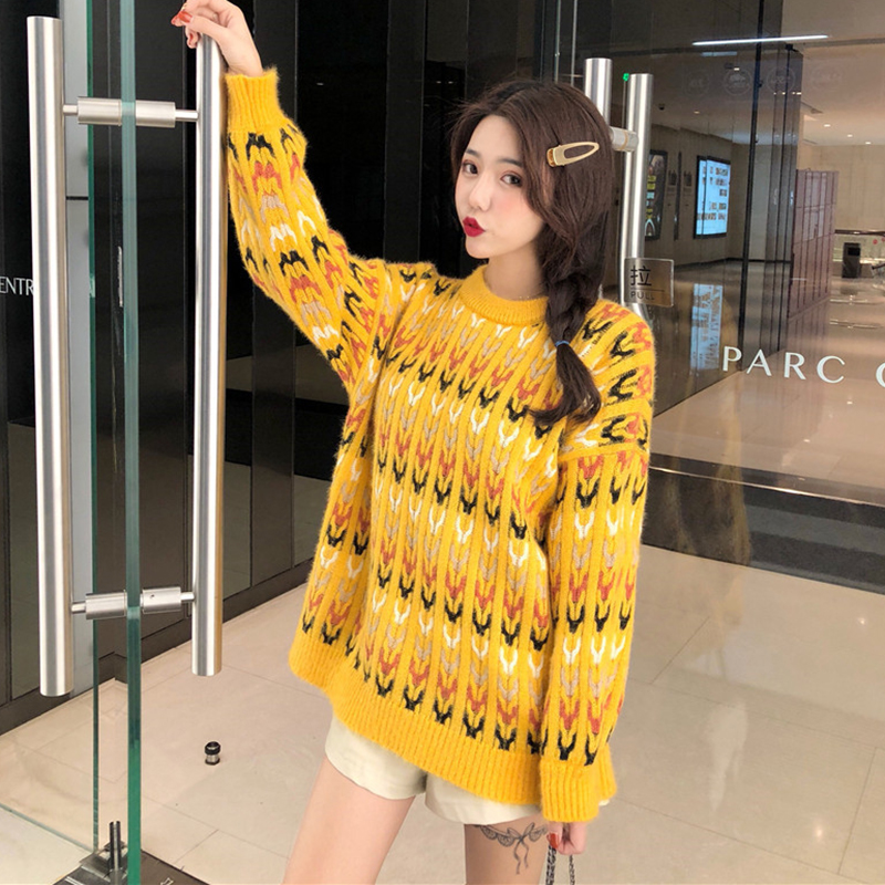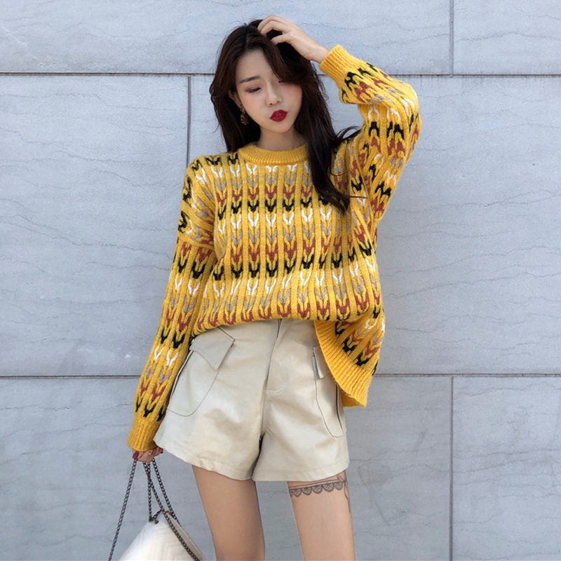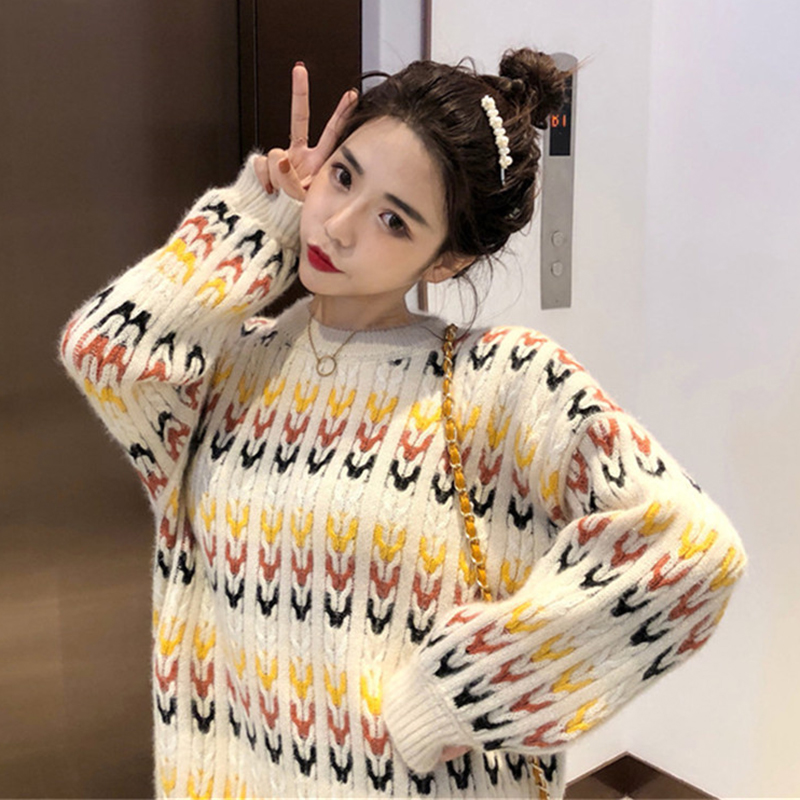 chic慵懶風花色麻花毛衣外套女秋冬裝2018新款韓版寬松長袖針織衫