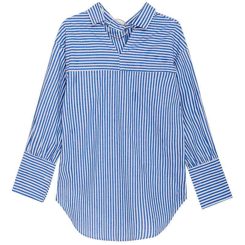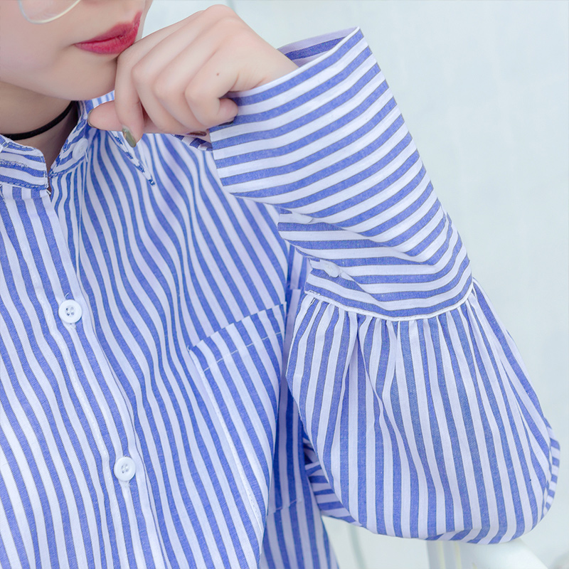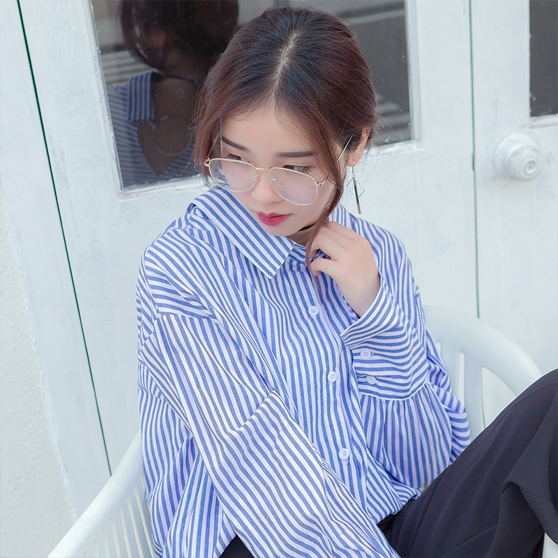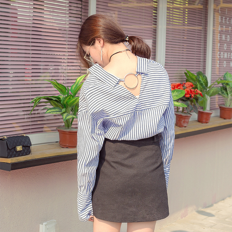/ 春裝新款韓版中長款露背條紋襯衫女寬松學院風長袖襯衣上衣潮