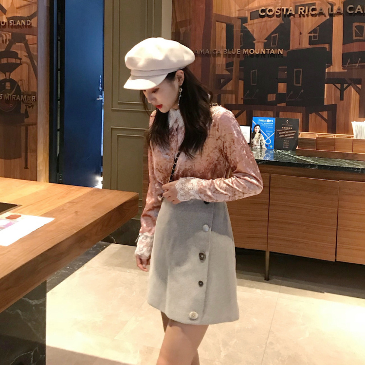 韓版金絲絨花邊領襯衫上衣+修身顯瘦排扣短款A字裙高腰半身裙套裝