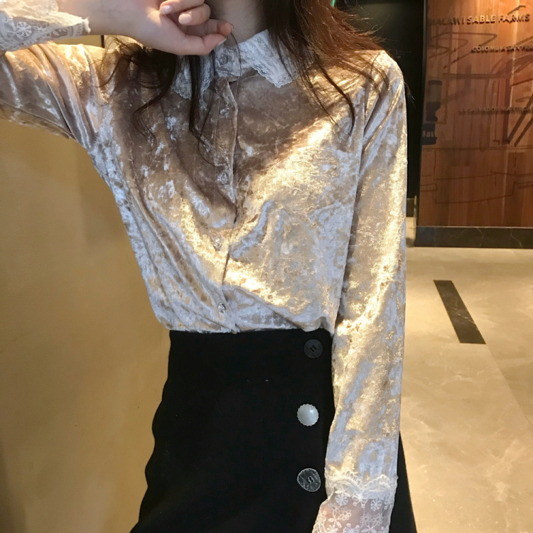 / 韓版金絲絨花邊領襯衫上衣+修身顯瘦排扣短款A字裙高腰半身裙套裝