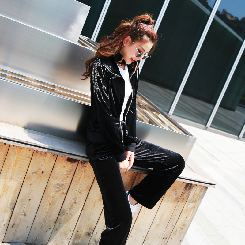 / 2018春季新款韓版跑步運動黑絲絨休閑套裝時尚修身顯瘦兩件套女潮