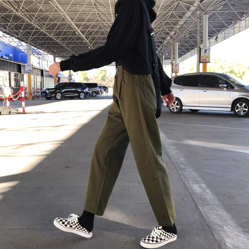 / 秋季女裝韓版寬松顯瘦高腰工裝休閑褲半松緊腰闊腿褲九分褲直筒褲