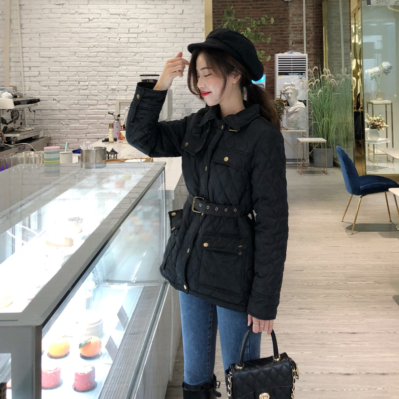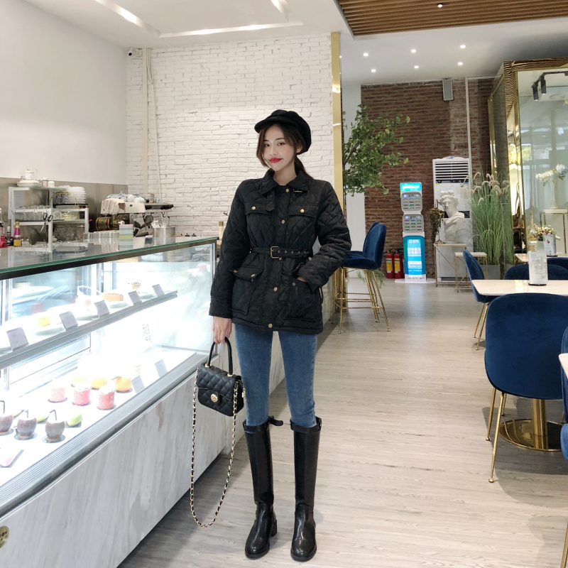 時尚chic外套女秋冬2018新款韓版百搭潮流短款夾克棉服外套配腰帶