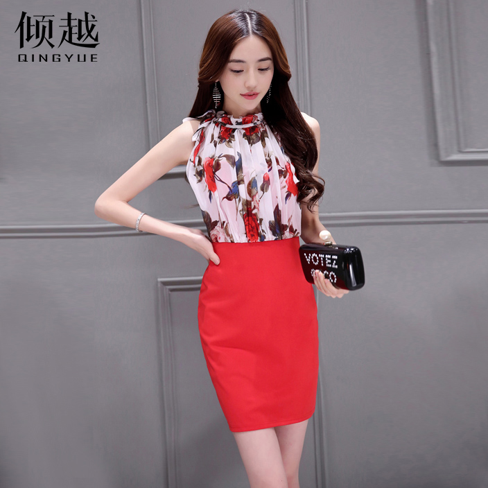 傾越韓版新款連體雪紡連衣裙時尚女裝性感2017夏修身包臀套裝裙潮