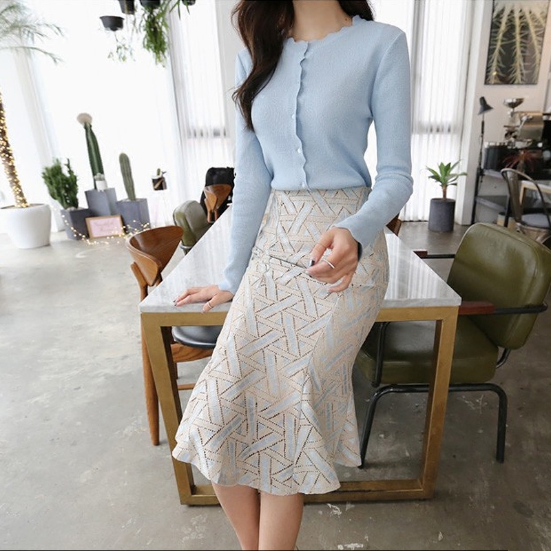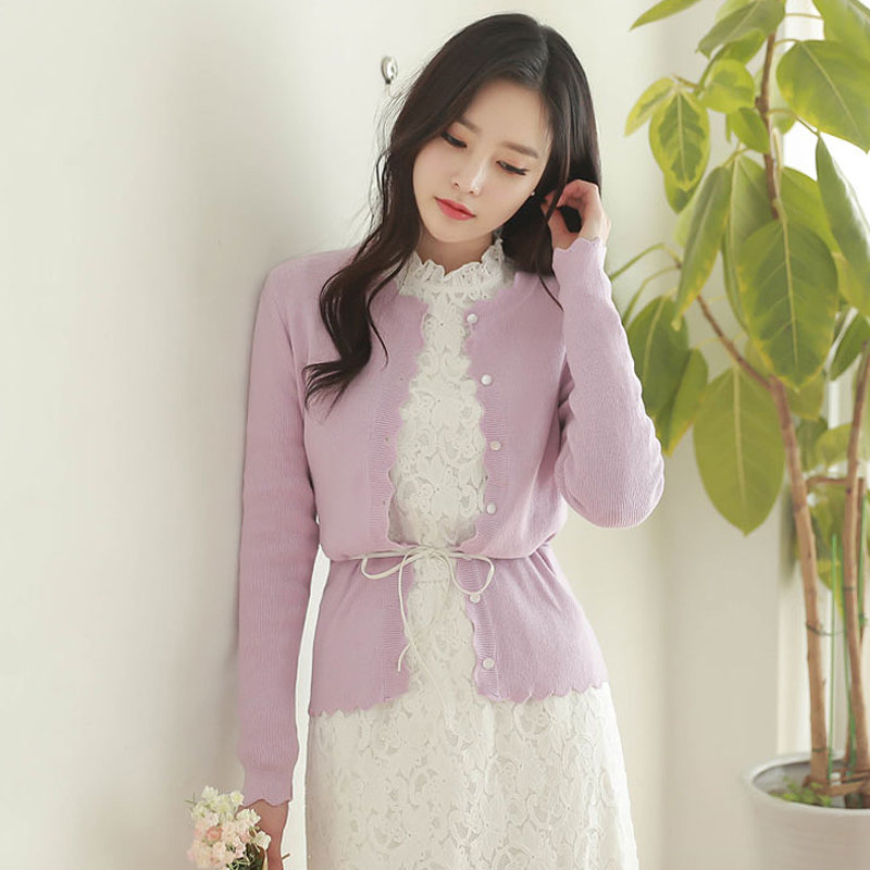 / 針織衫女開衫春秋短款長袖通勤針織外套女韓版純色波浪袖開衫毛衣