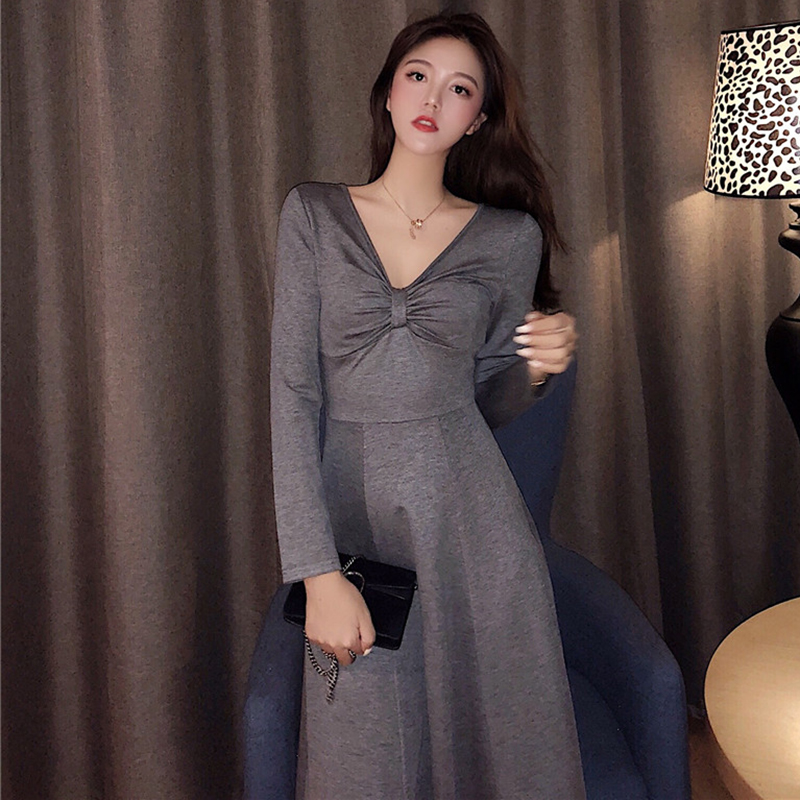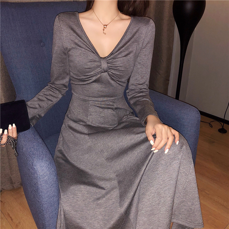 / 法式少女修身顯瘦針織連衣裙子秋冬裝新款氣質V領egg風A字桔梗裙