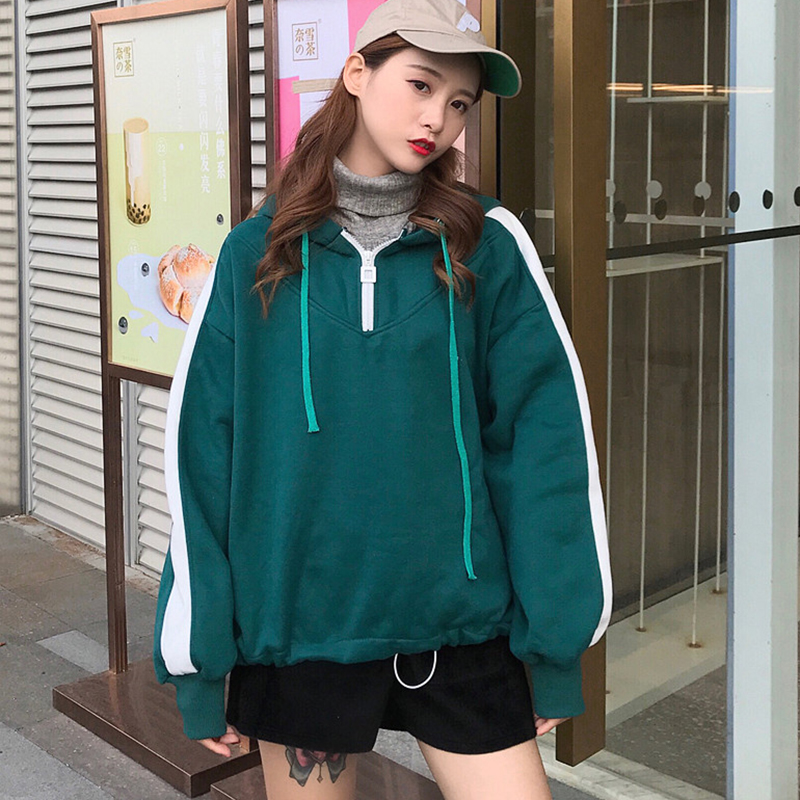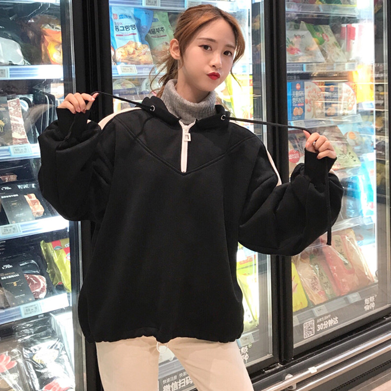 / 慵懶風寬松假兩件衛衣2018新款女秋冬裝高領拼色加絨外套長袖上衣
