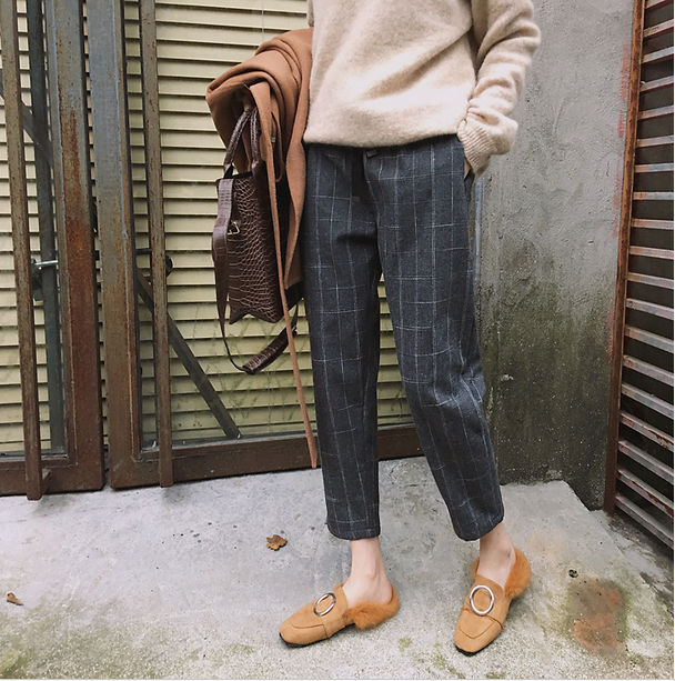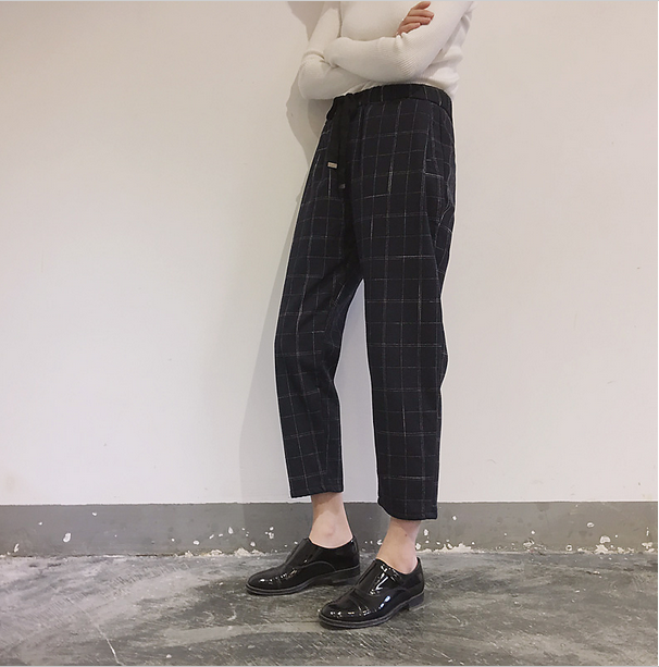 / 早春新款女裝學院風格子抽繩松緊腰寬松顯瘦百搭哈倫褲九分休閑褲