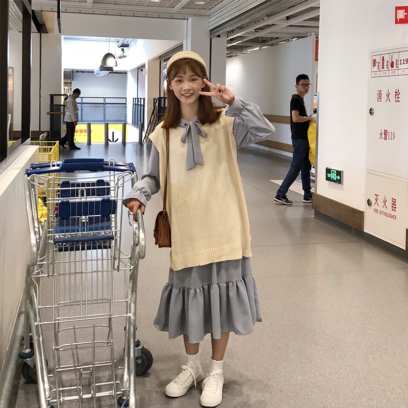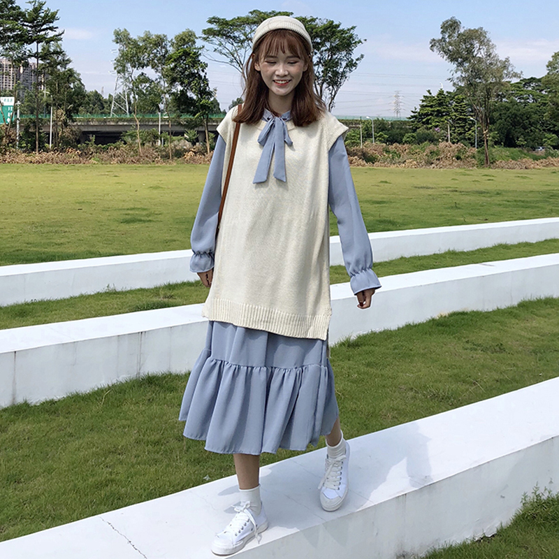 / 韓版時尚休閑套裝秋裝女裝chic系帶荷葉邊連衣裙+針織馬甲兩件套