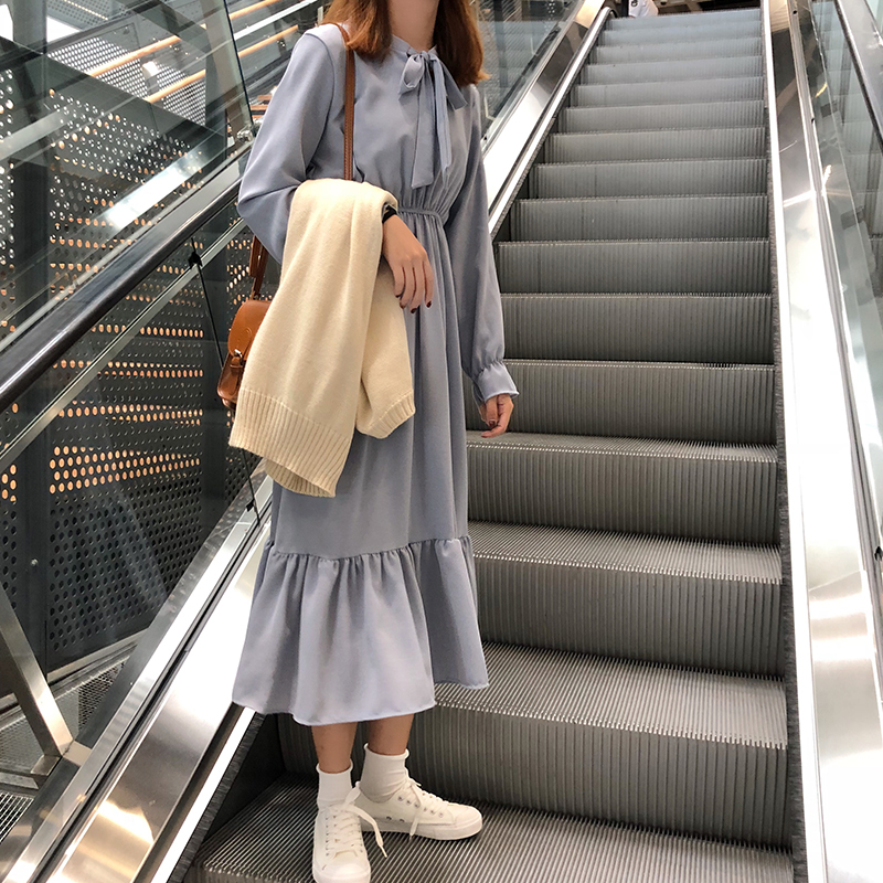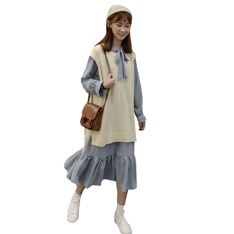 韓版時尚休閑套裝秋裝女裝chic系帶荷葉邊連衣裙+針織馬甲兩件套