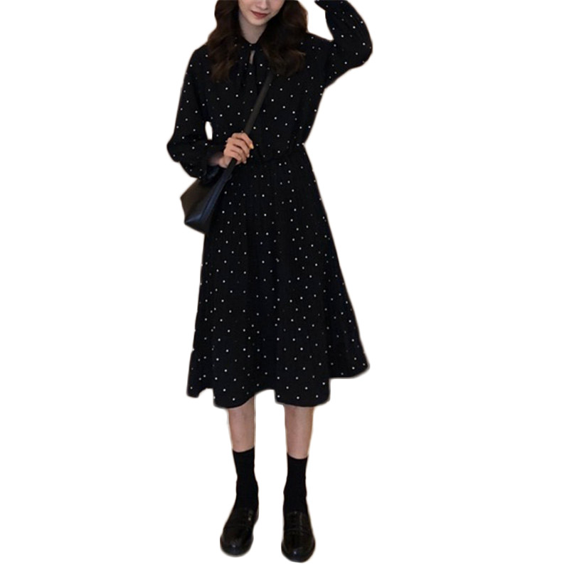 / 韓版chic早秋裙子長短款女慵懶風新款百搭波點長袖裙擺壓褶連衣裙