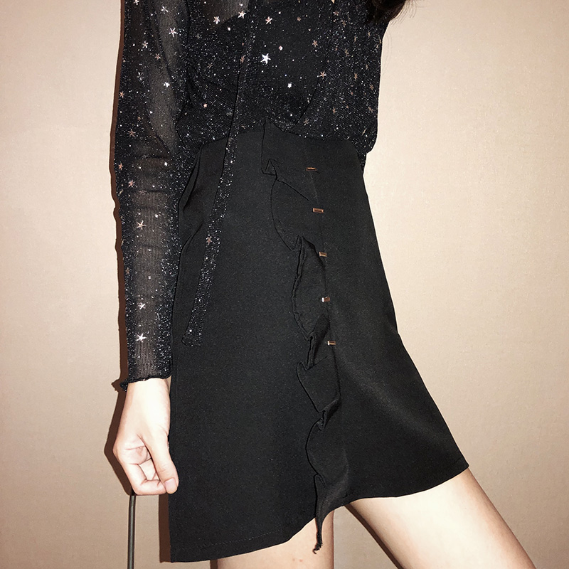 套裝女秋新款星星V領長袖打底衫上衣高腰顯瘦荷葉邊黑色A字短裙子
