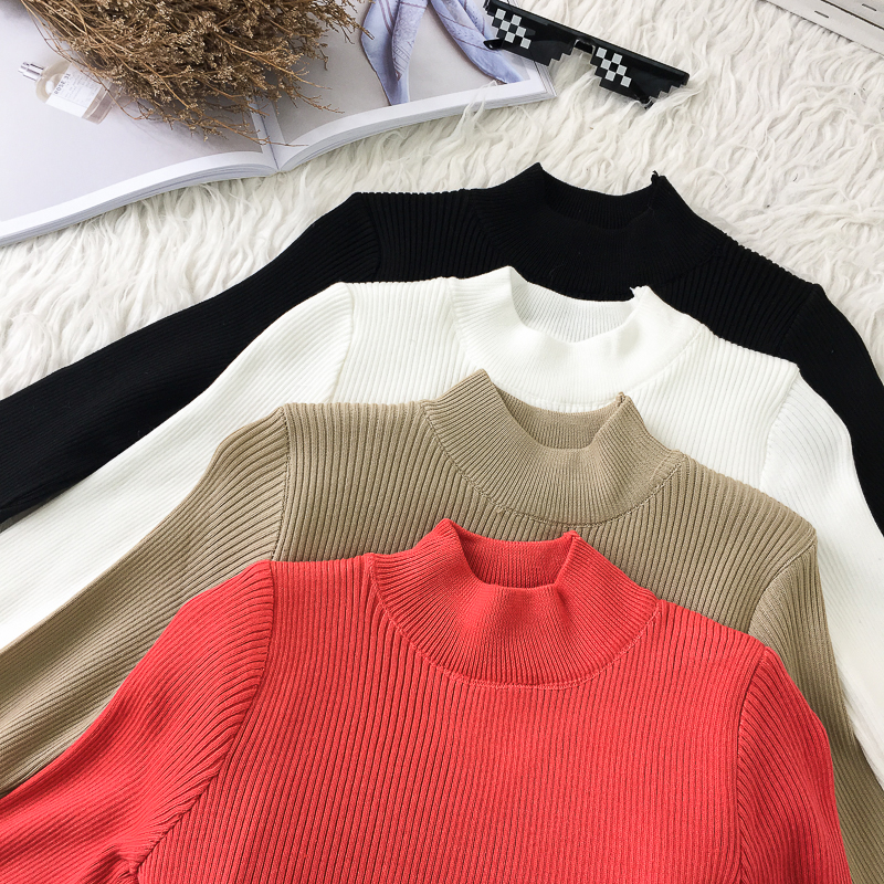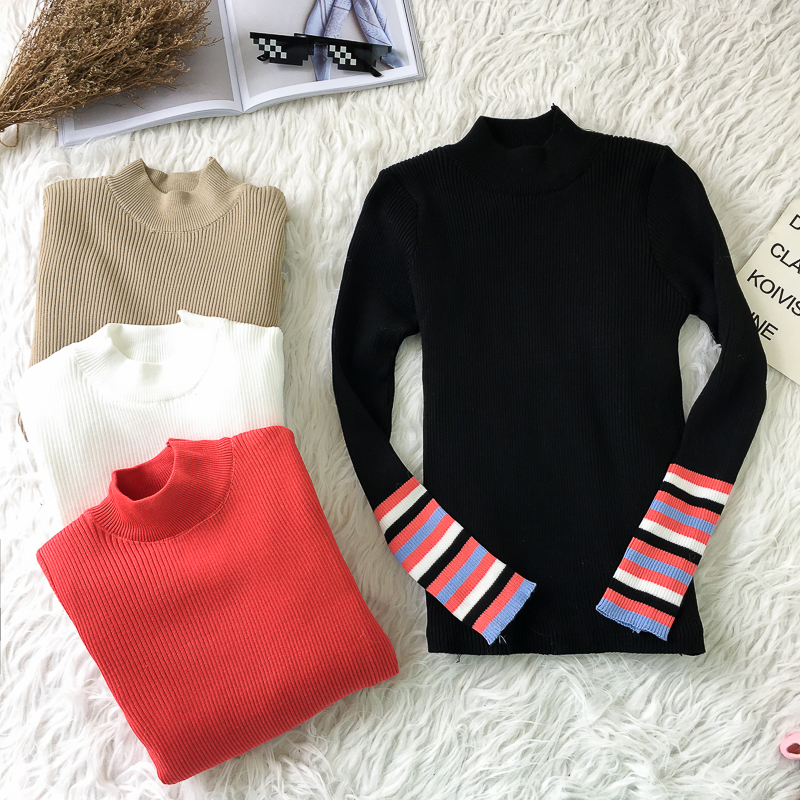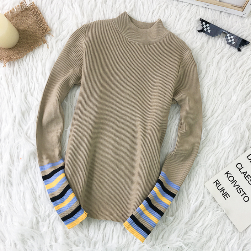 / 條紋撞色加絨毛衣女秋冬裝2018新款韓版修身顯瘦長袖打底針織上衣