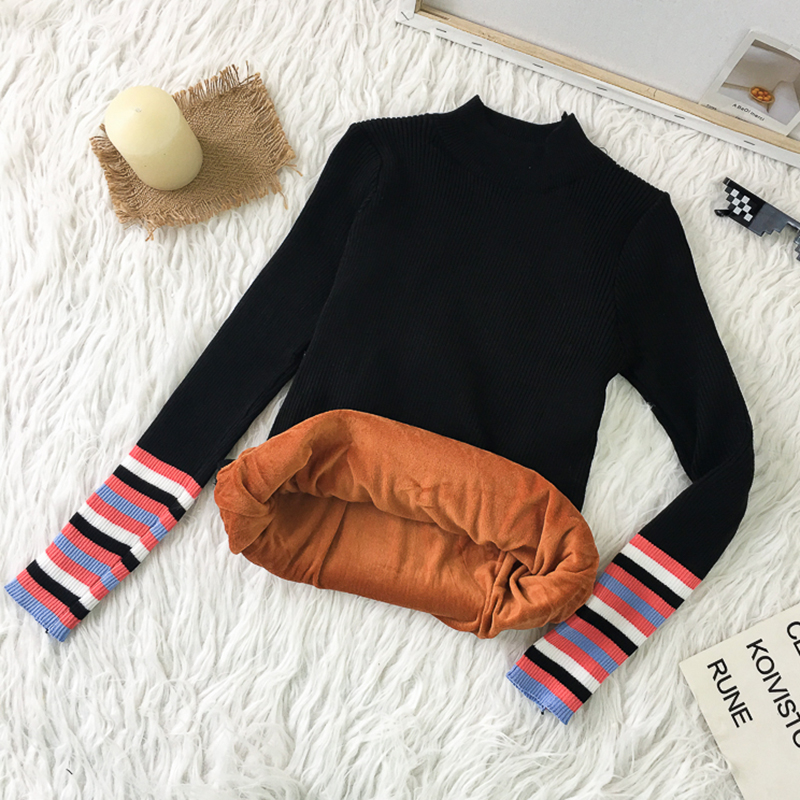 條紋撞色加絨毛衣女秋冬裝2018新款韓版修身顯瘦長袖打底針織上衣