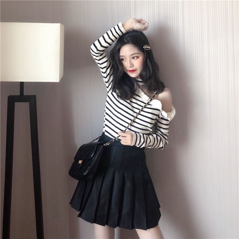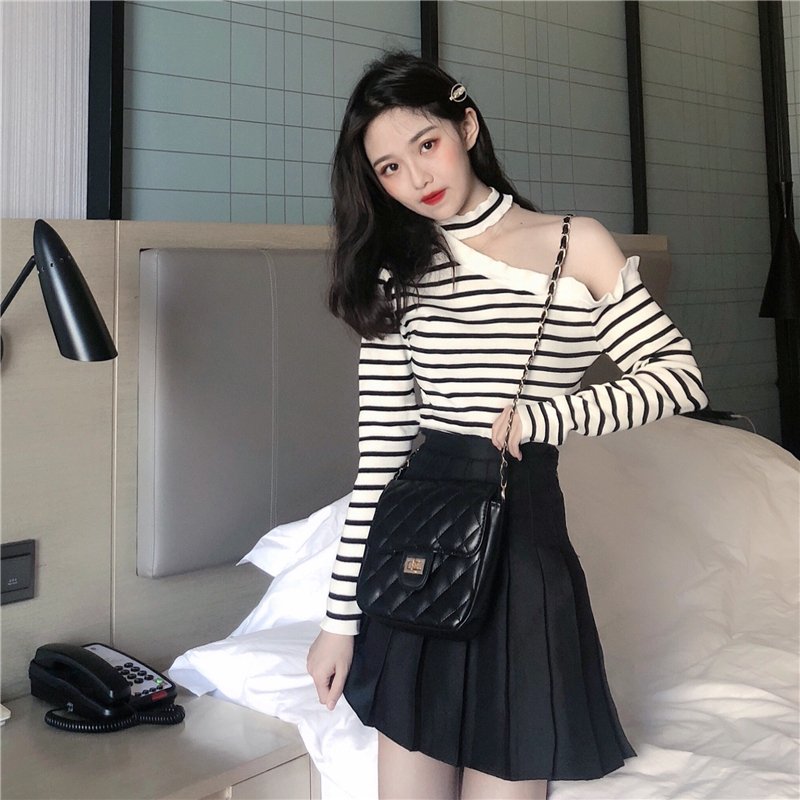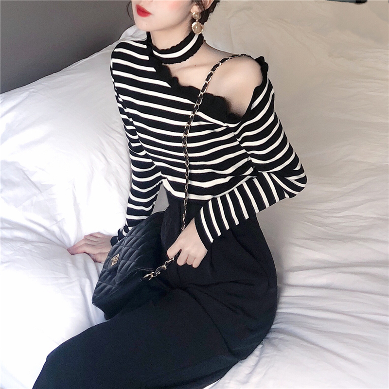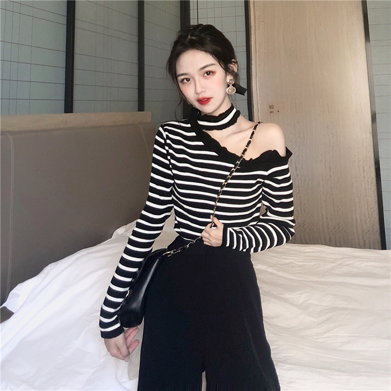 / 韓國新款心機露肩掛脖條紋秋裝氣質針織衫復古打底修身顯瘦上衣女