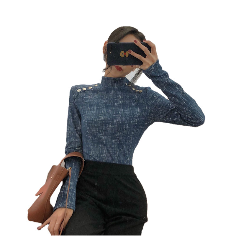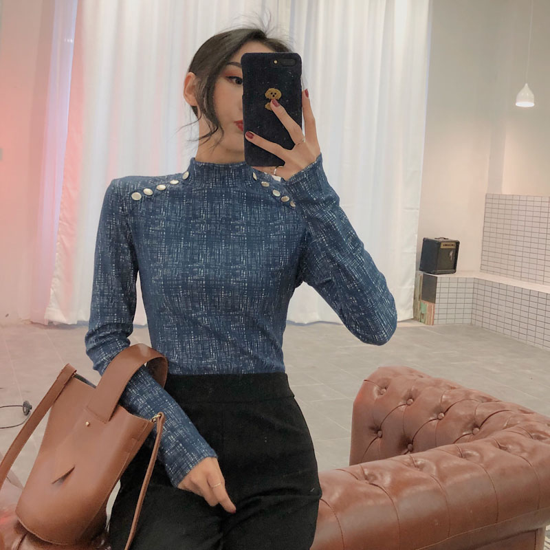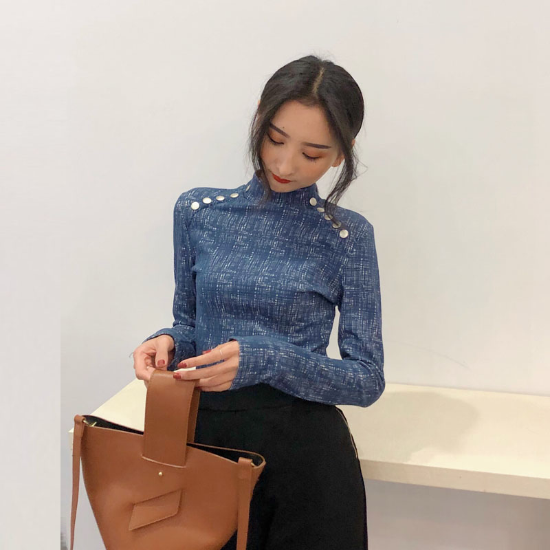 chic早秋上衣女新款韓版百搭復古港味金屬扣立領修身打底衫T恤潮