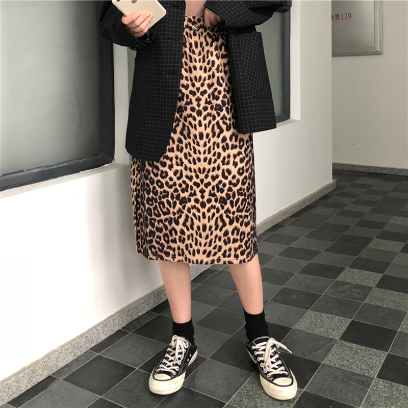 / 港味中長款側開叉豹紋半身裙女冬裝2018新款松緊高腰顯瘦A字裙子