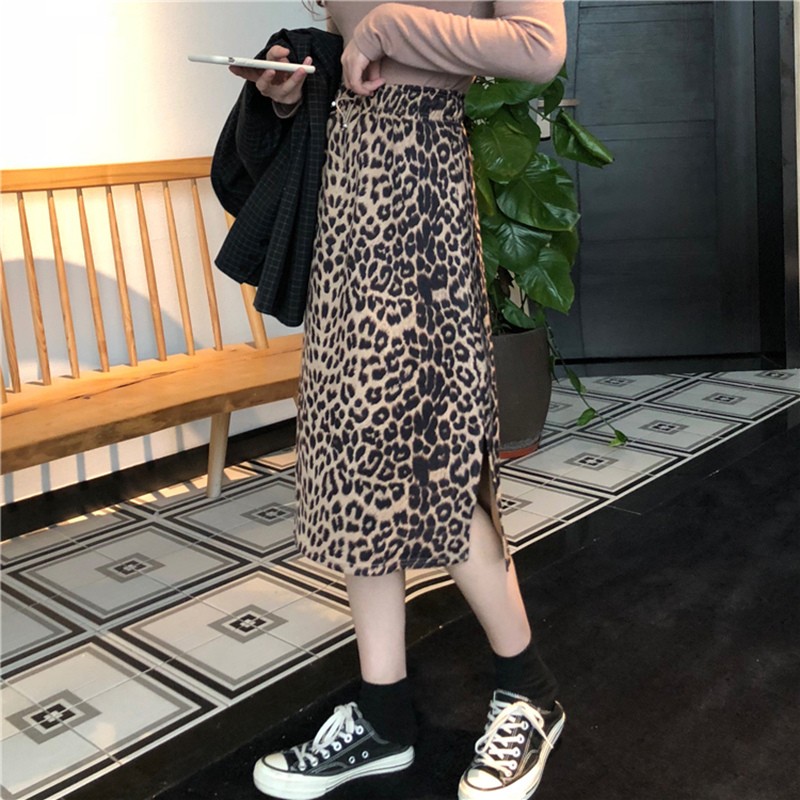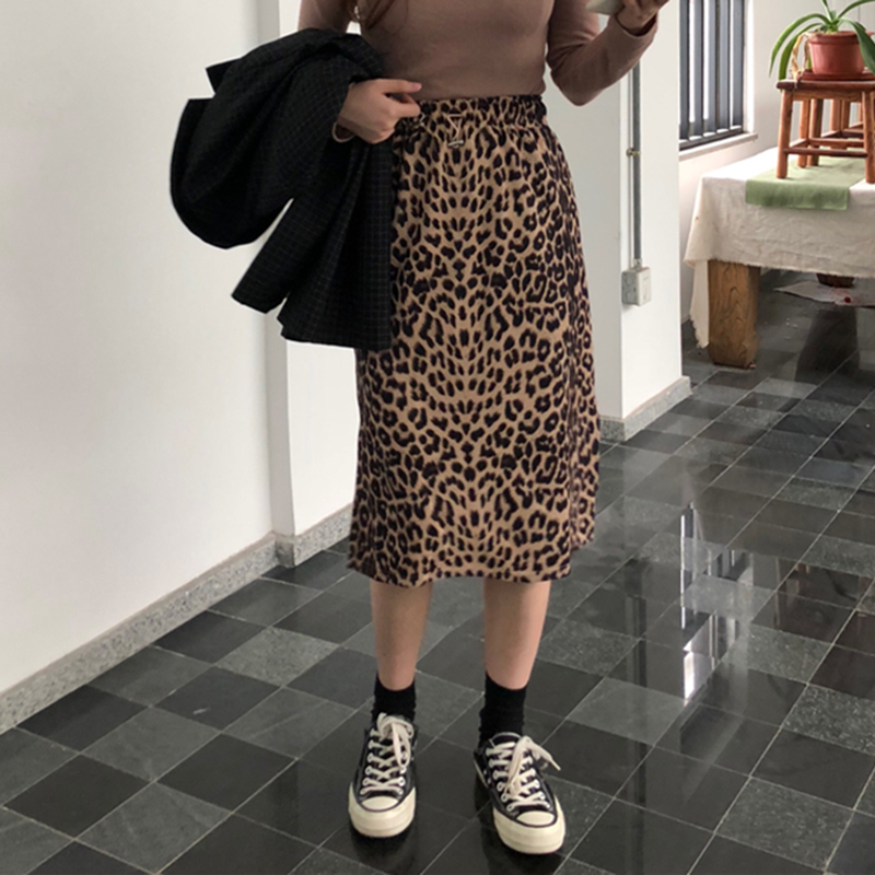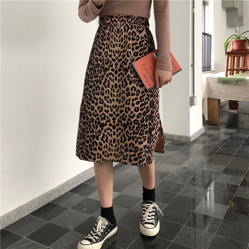港味中長款側開叉豹紋半身裙女冬裝2018新款松緊高腰顯瘦A字裙子
