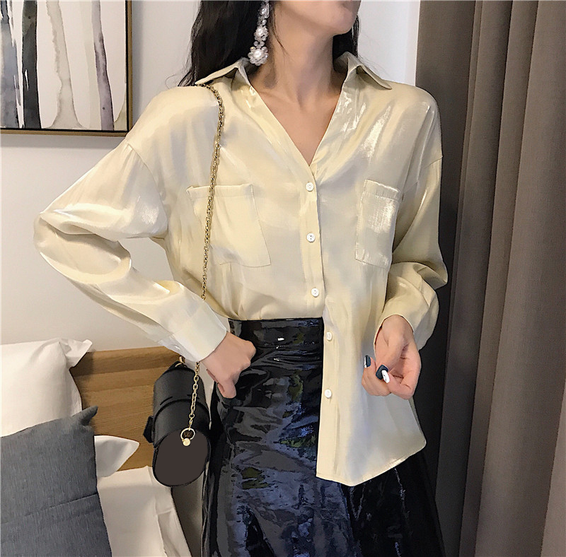 2018新款秋裝時尚百搭氣質上衣純色港風韓版寬松v領珠光長袖襯衫