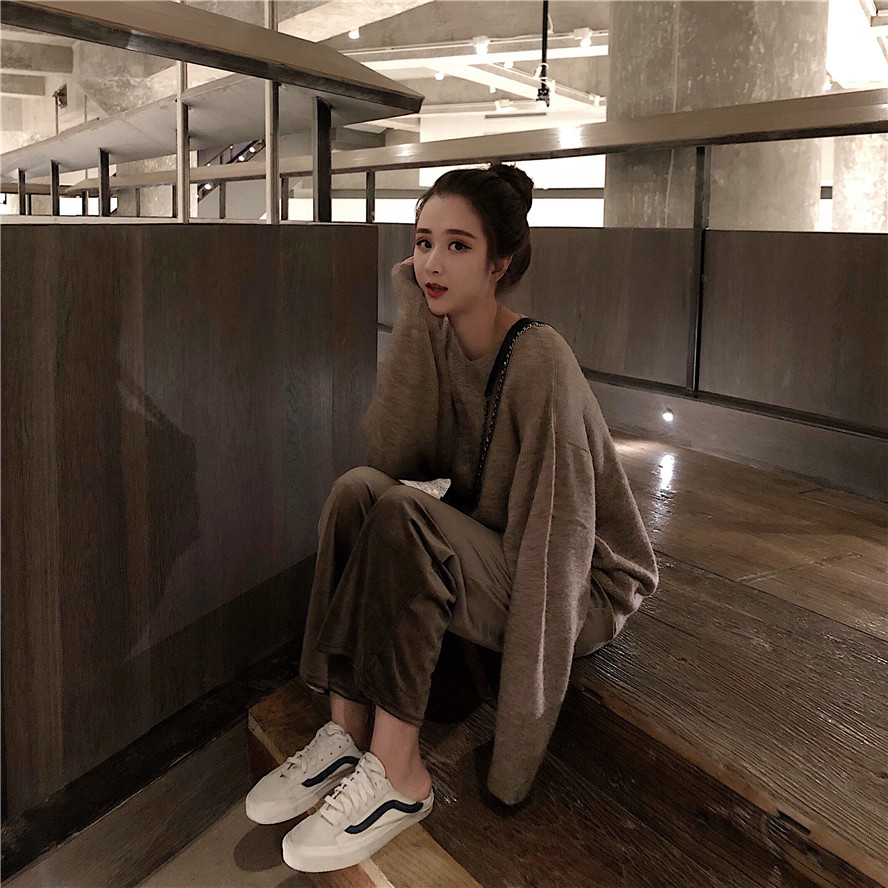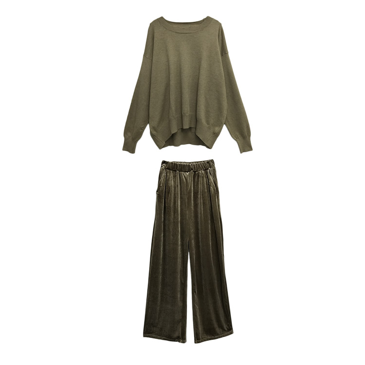 / 秋季套裝女時尚兩件套落肩寬松圓領毛衣+絲絨褲松緊寬松顯瘦長褲
