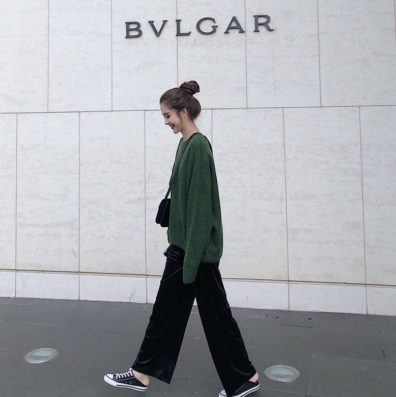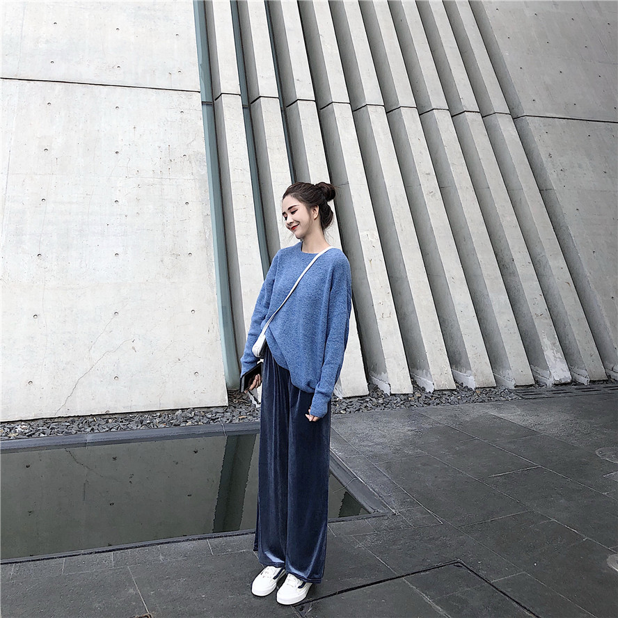 秋季套裝女時尚兩件套落肩寬松圓領毛衣+絲絨褲松緊寬松顯瘦長褲