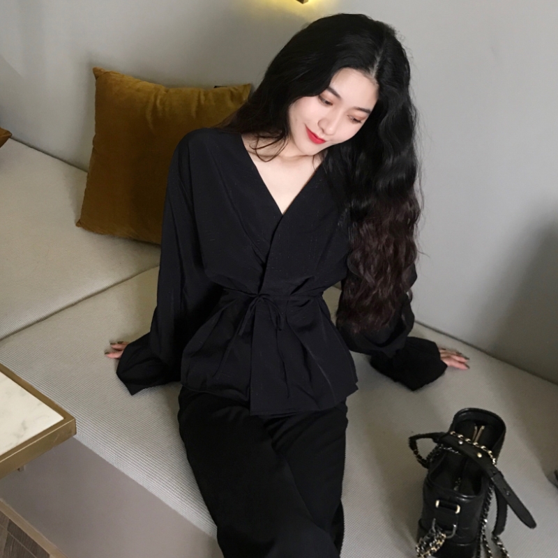/ chic早秋上衣慵懶時尚秋裝女2018新款收腰系帶顯瘦喇叭袖上衣T恤