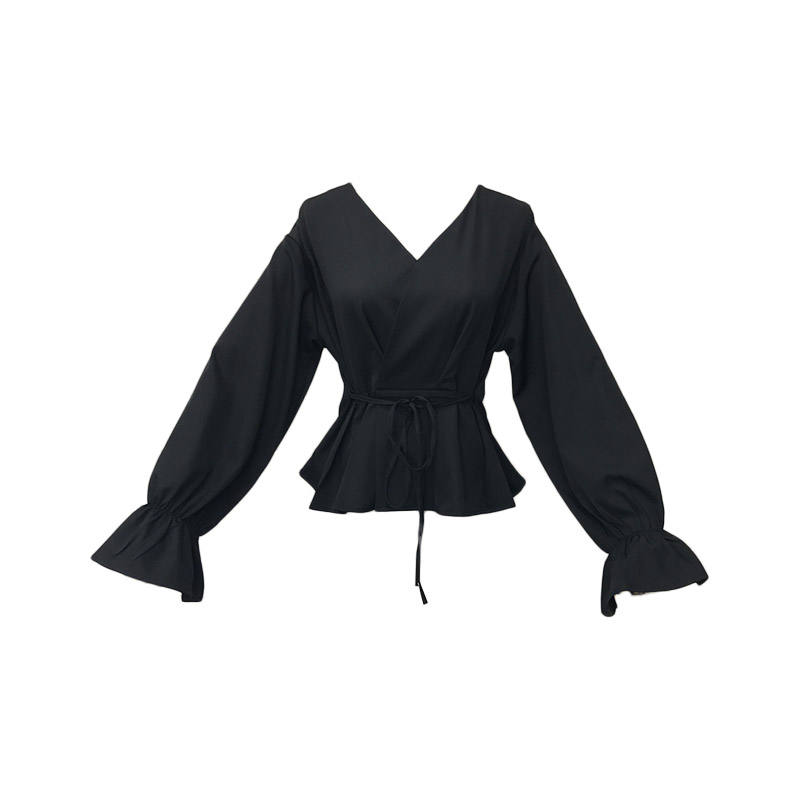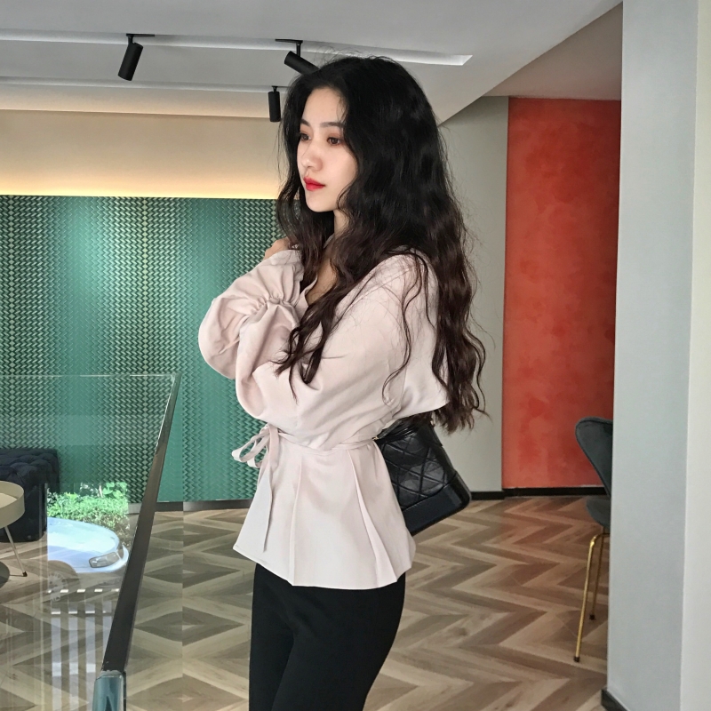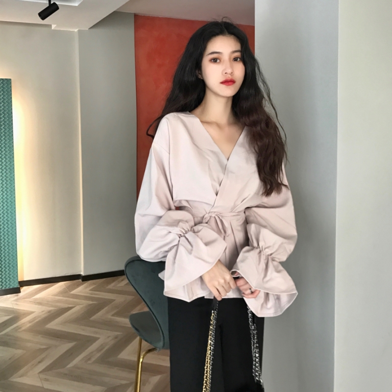 chic早秋上衣慵懶時尚秋裝女2018新款收腰系帶顯瘦喇叭袖上衣T恤