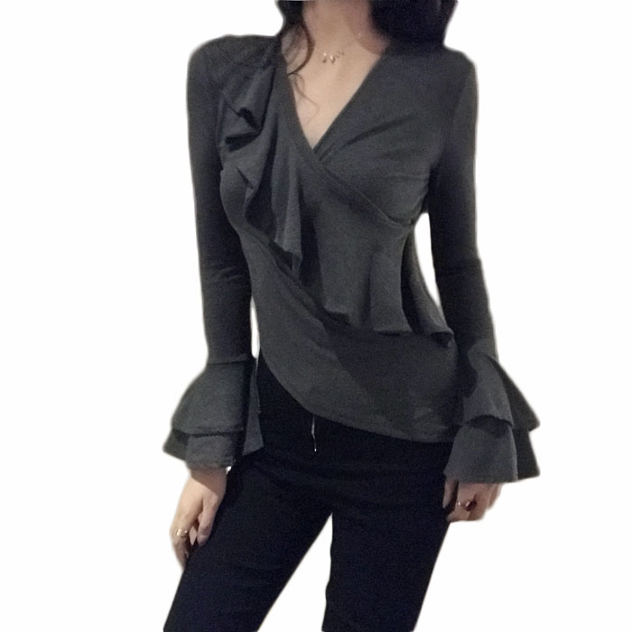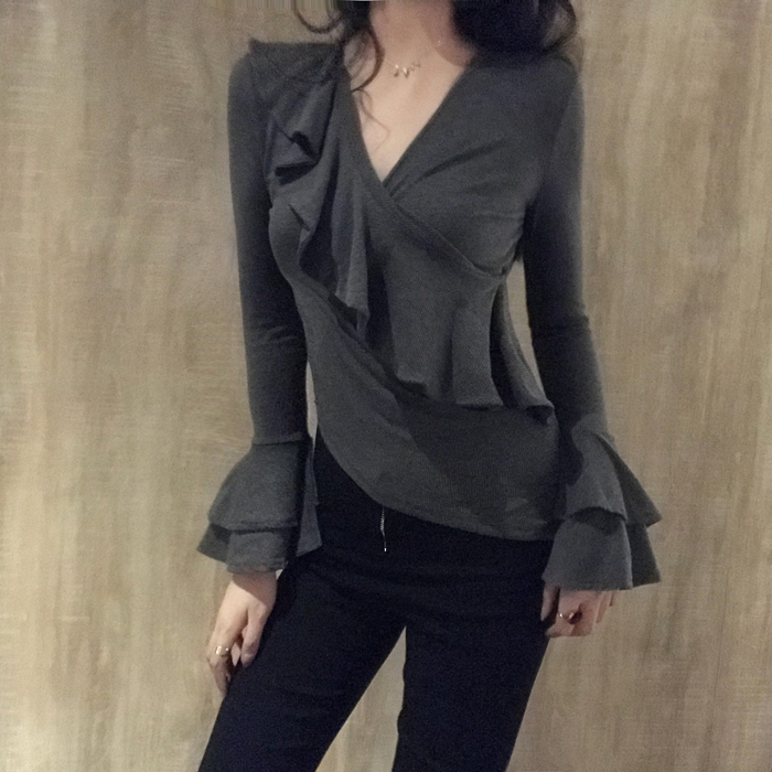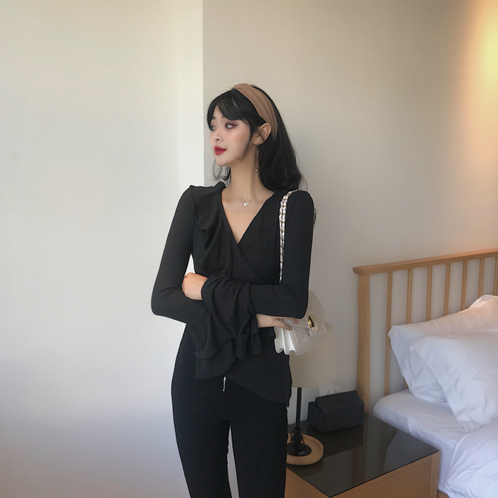 / 韓版復古V領荷葉邊不規則修身喇叭袖打底上衣秋冬長袖內搭T恤女潮