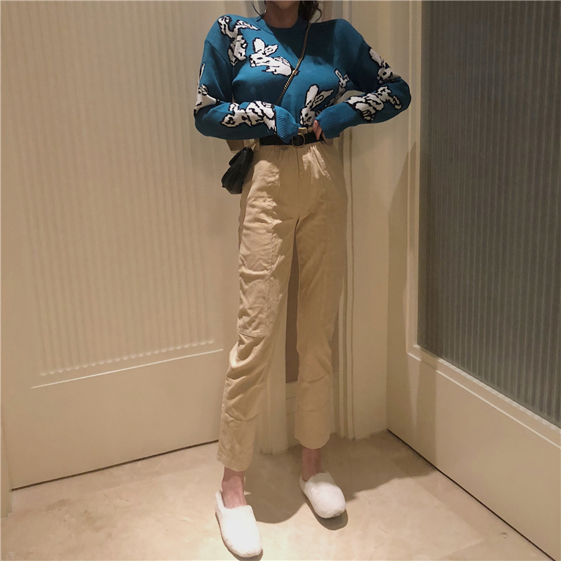 洋氣套裝女秋冬新款寬松卡通套頭針織衫毛衣外套寬松高腰休閑褲子