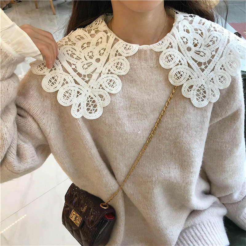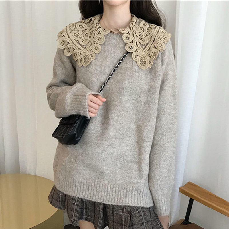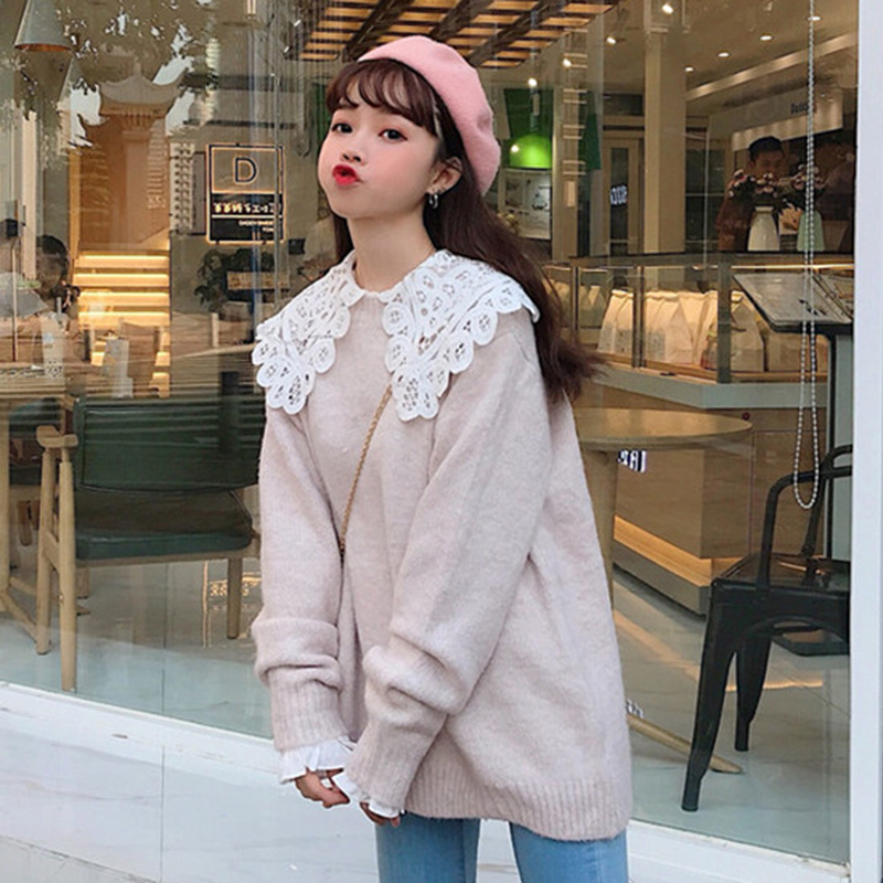 秋裝女2018新款學生長袖針織衫寬松毛衣甜美蕾絲領襯衫上衣兩件套