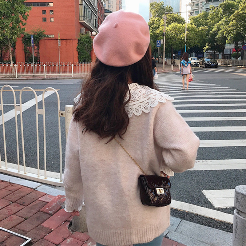 淺粉色毛衣|淺咖色毛衣|咖色蕾絲領襯衫|白色蕾絲領襯衫