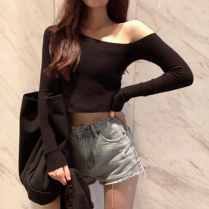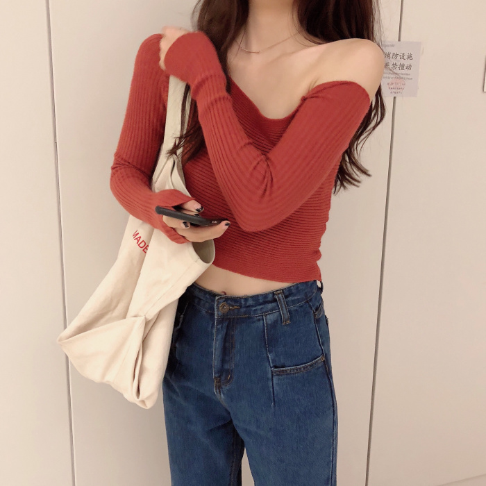 韓版時尚秋裝女2018新款百搭露斜肩漏鎖骨針織衫短款小心機上衣潮