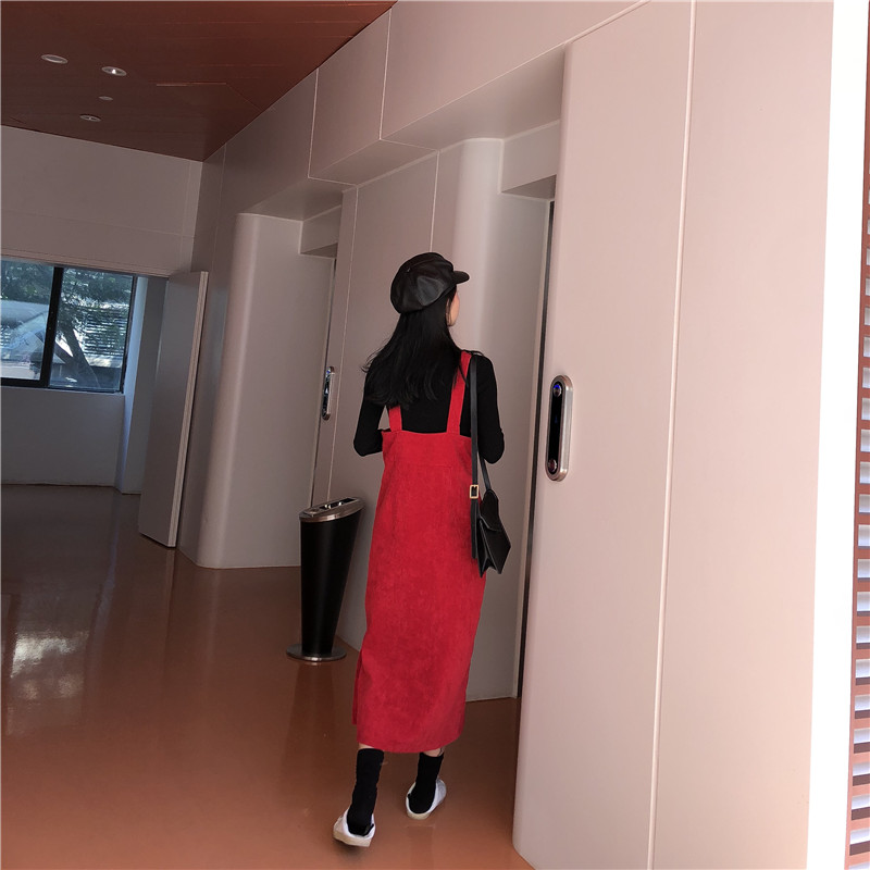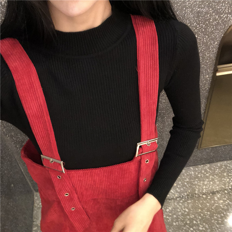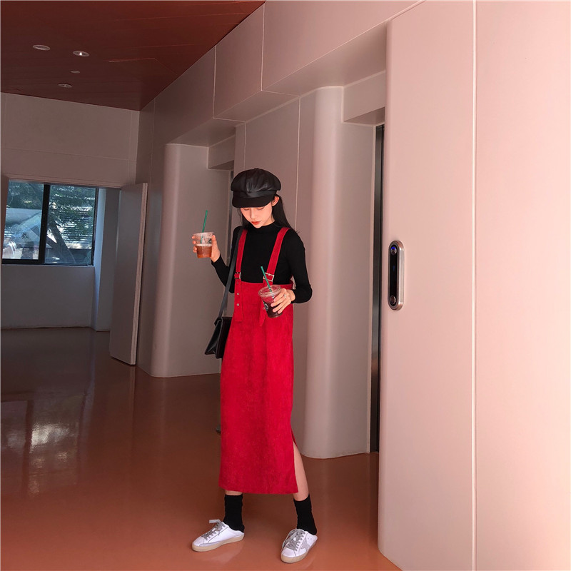 學院風基礎修身長袖百搭針織打底衫+復古純色開叉燈芯絨背帶裙子