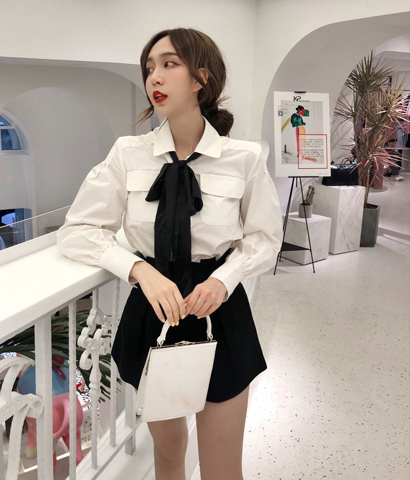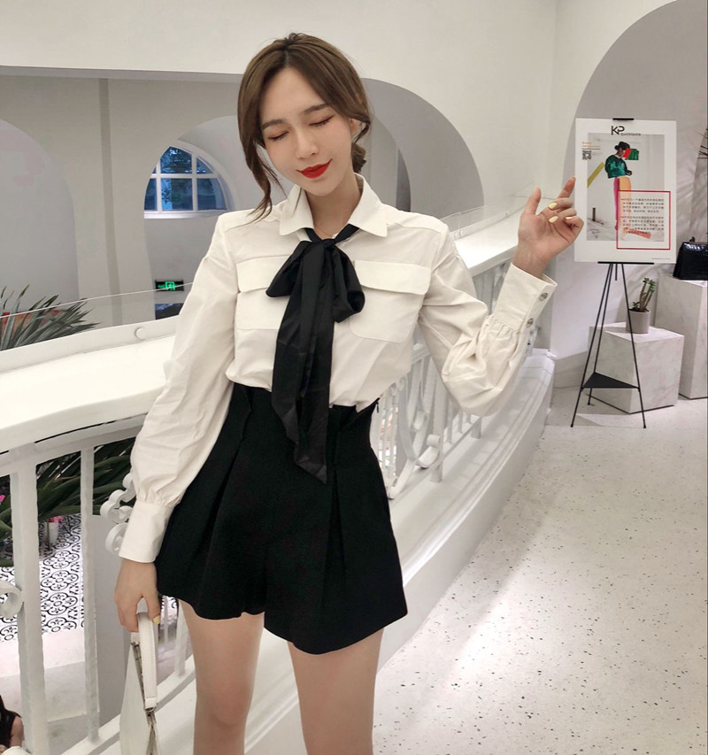 / 新款秋季韓版純色翻領襯衫立體剪裁闊腿高腰短褲時尚套裝女配領帶