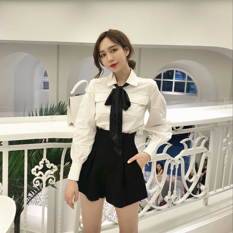 新款秋季韓版純色翻領襯衫立體剪裁闊腿高腰短褲時尚套裝女配領帶
