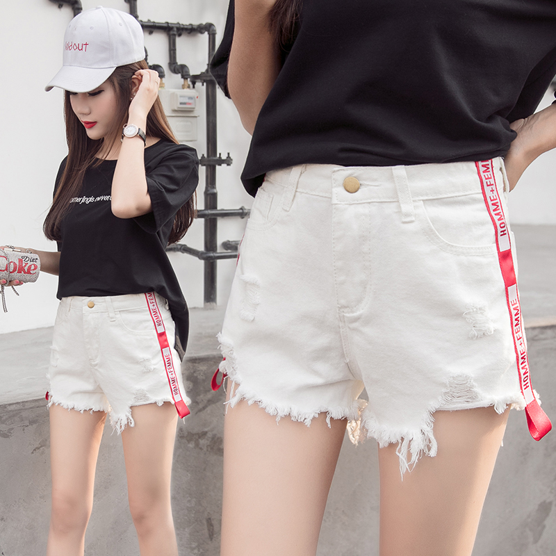 / 夏季韓版高腰破洞牛仔短褲大碼學生熱褲磨破毛邊不規則闊腿褲