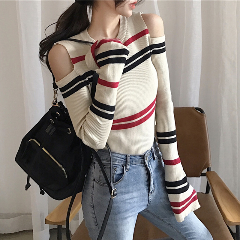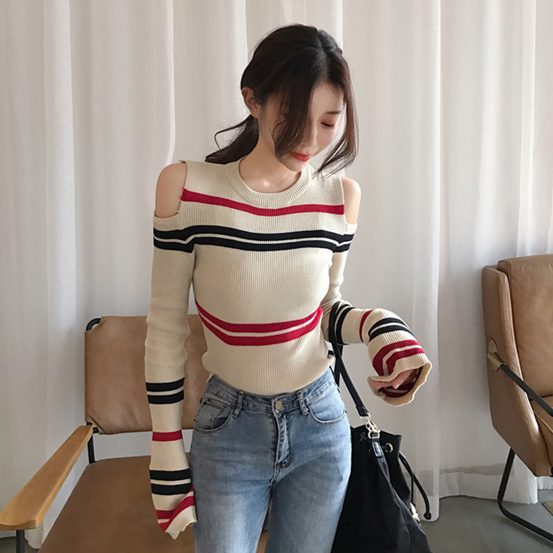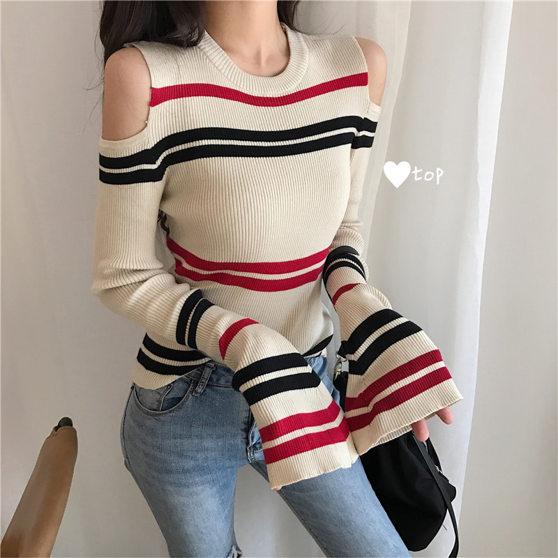 秋冬女裝2018新款韓版修身條紋打底毛衣小心機露肩叭袖長袖針織衫