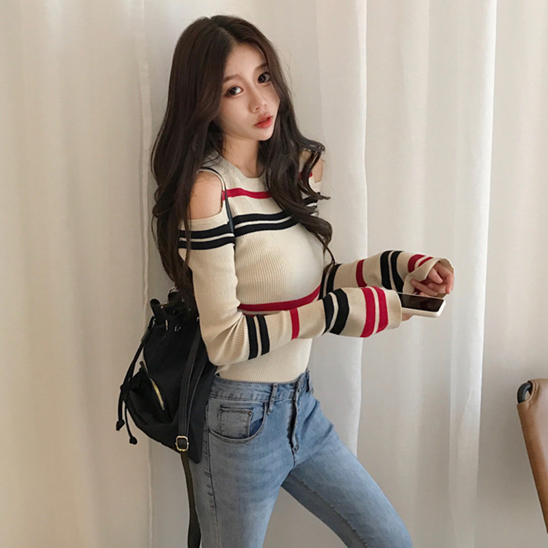 / 秋冬女裝2018新款韓版修身條紋打底毛衣小心機露肩叭袖長袖針織衫