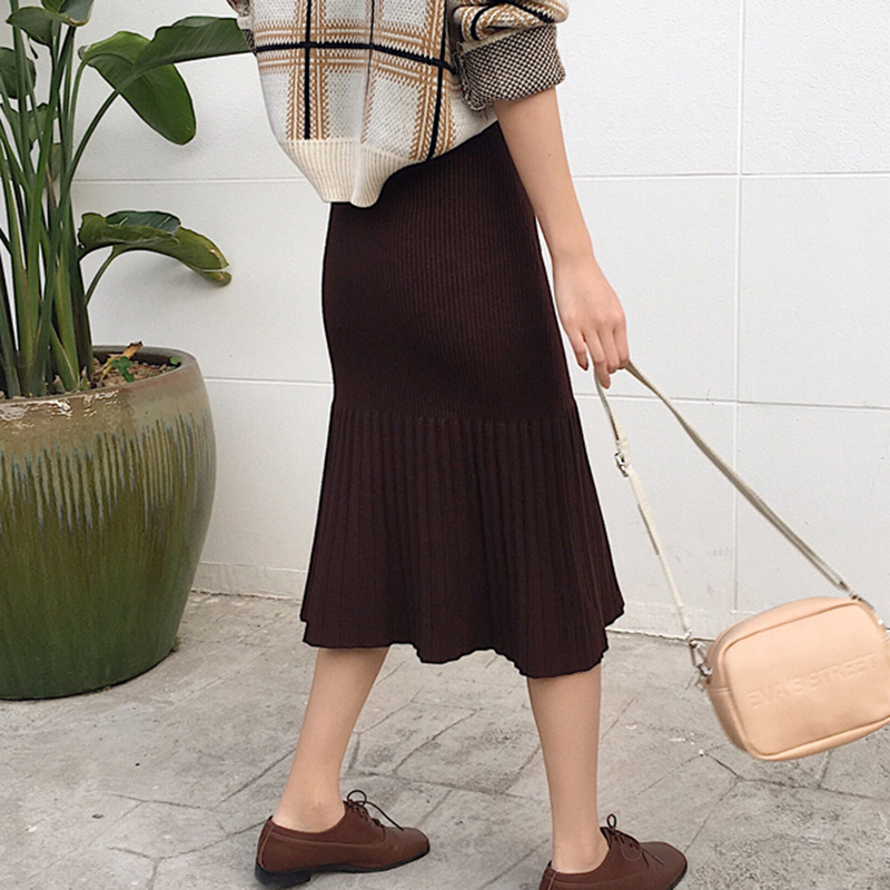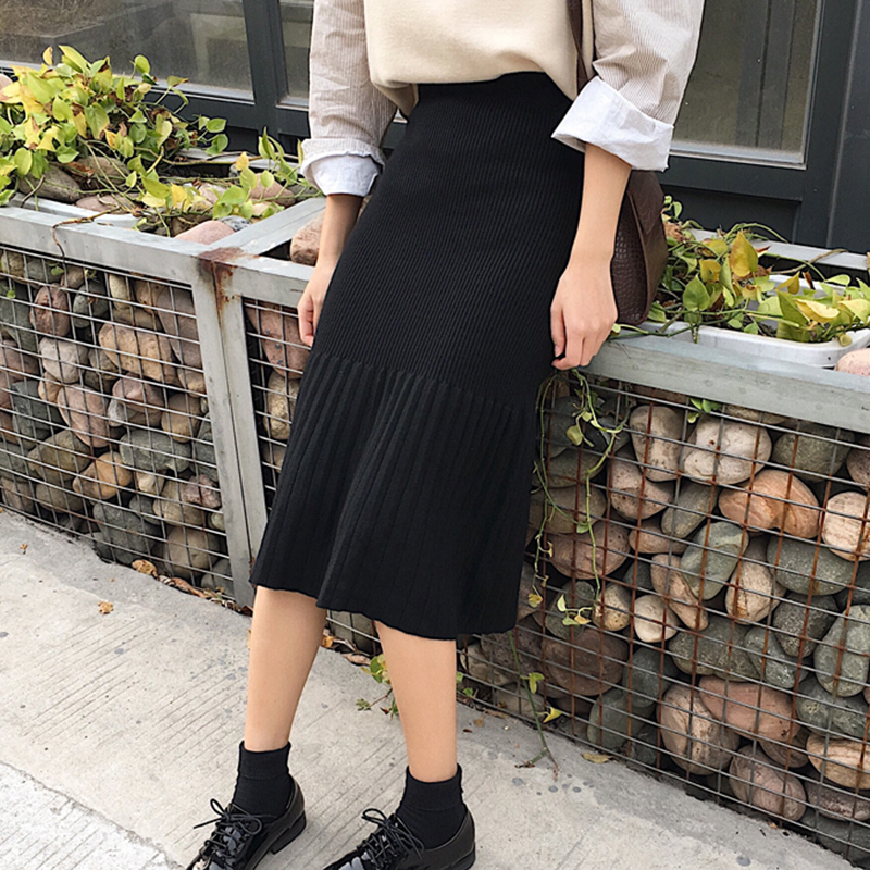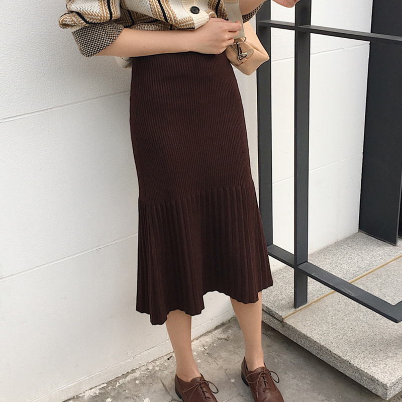 / 慵懶復古風針織半身裙秋裝女2018新款高腰百褶魚尾裙中長A字裙子