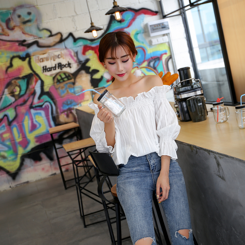/ 早春新款女裝露肩一字領寬松顯瘦燈籠袖長袖學生百搭襯衫上衣女