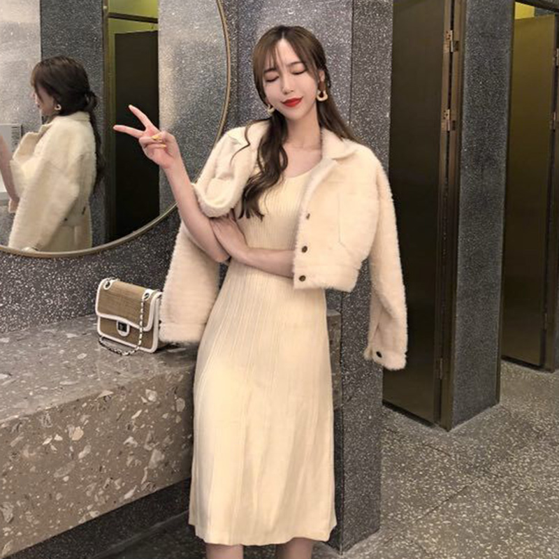 / 毛衣加裙子兩件套秋裝2018新款寬松短款毛絨外套休閑背心針織長裙