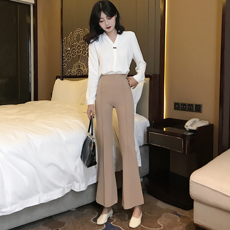 / 時尚套裝女秋季新款高腰黑色喇叭長褲子氣質修身V領雪紡襯衫上衣