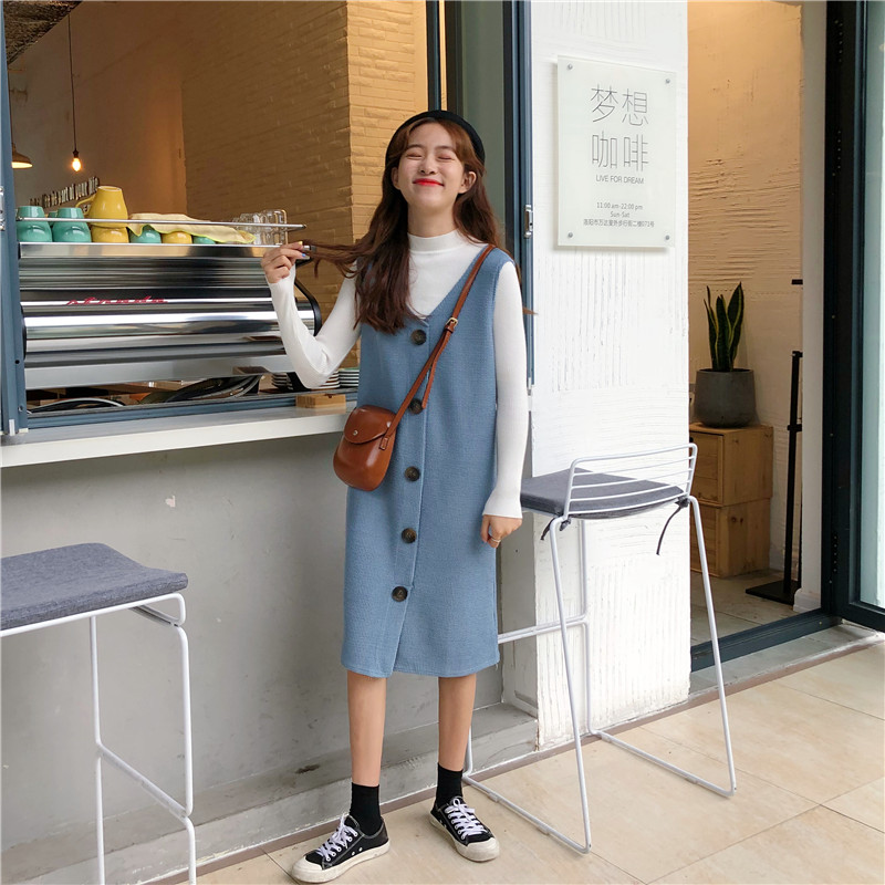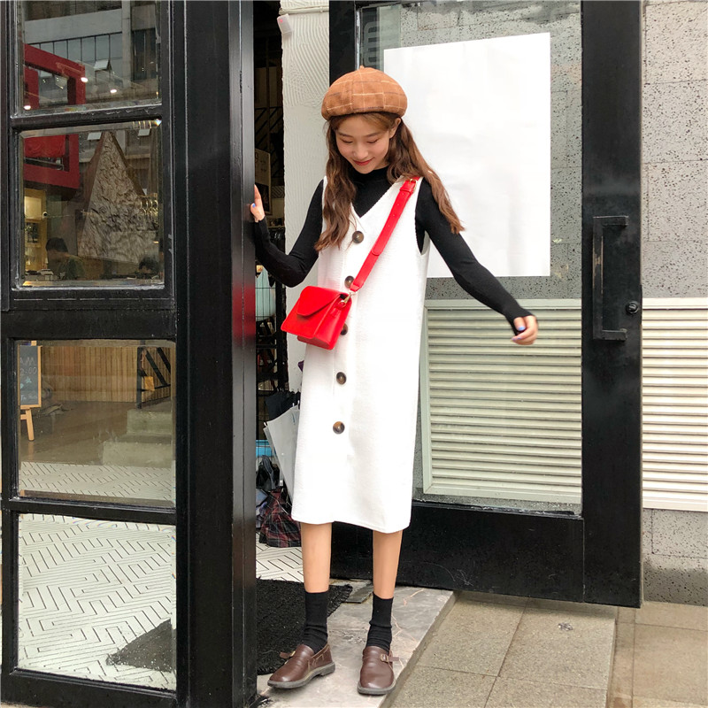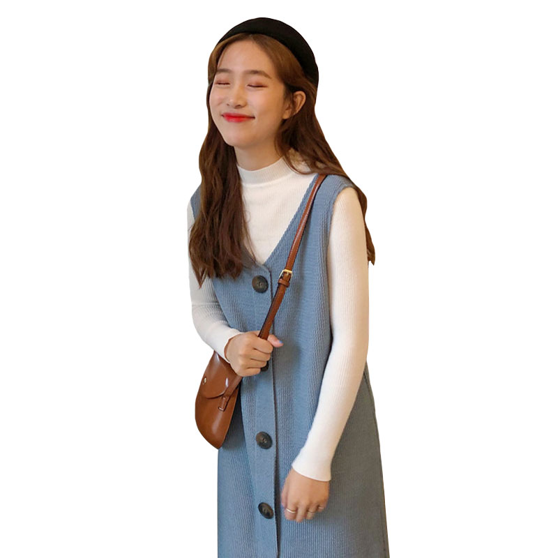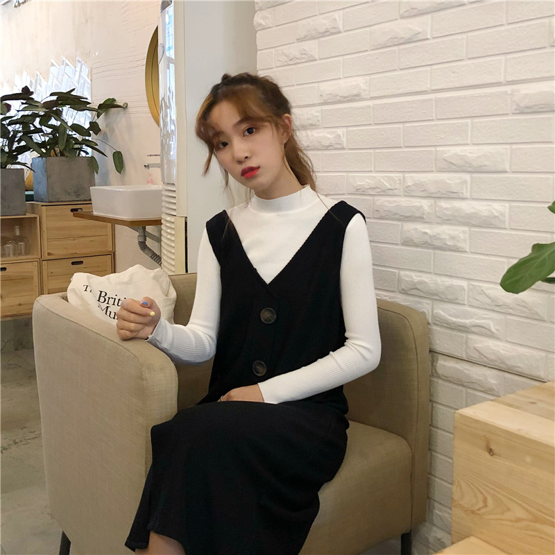 / 秋季女裝韓版時尚休閑套裝V領針織背心裙連衣裙+打底針織衫兩件套