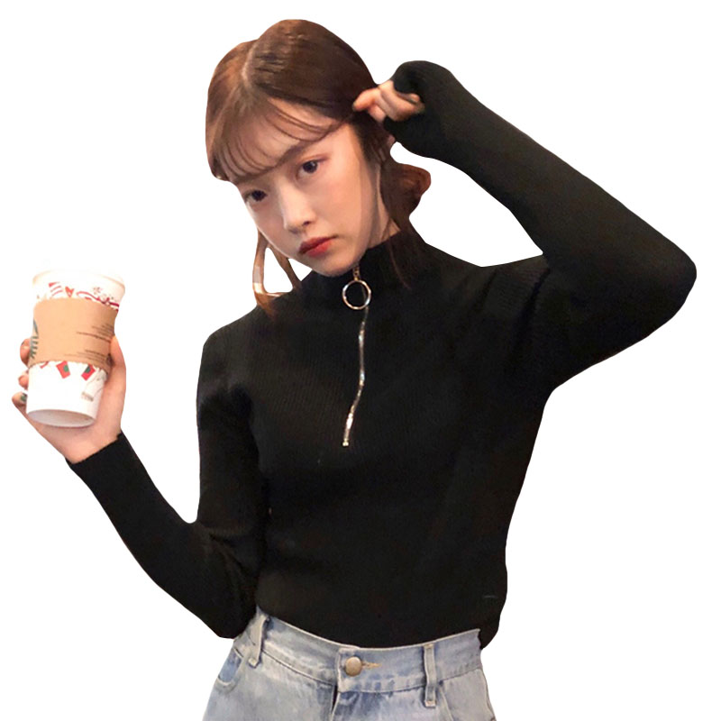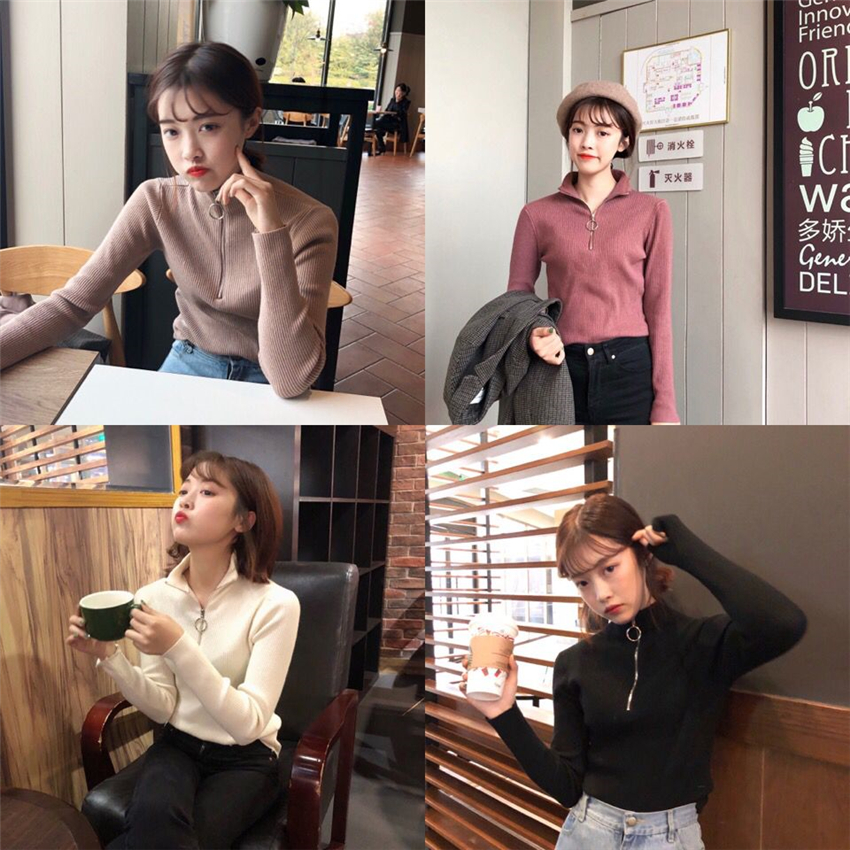 秋冬女裝韓版chic拉鏈半高領修身顯瘦打底毛衣長袖針織衫上衣外套