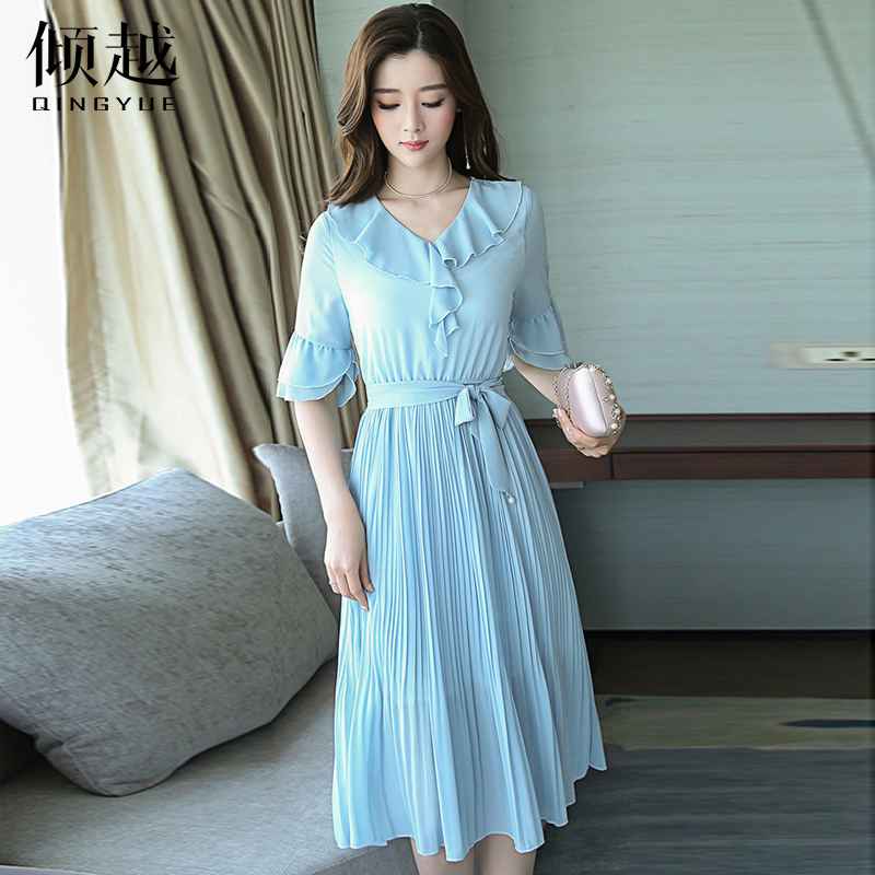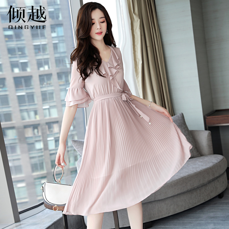 雪紡連衣裙夏短袖2017新款韓版氣質修身顯瘦收腰中長款百褶裙子潮