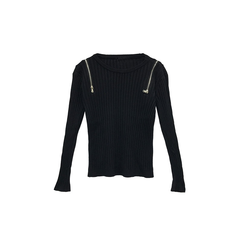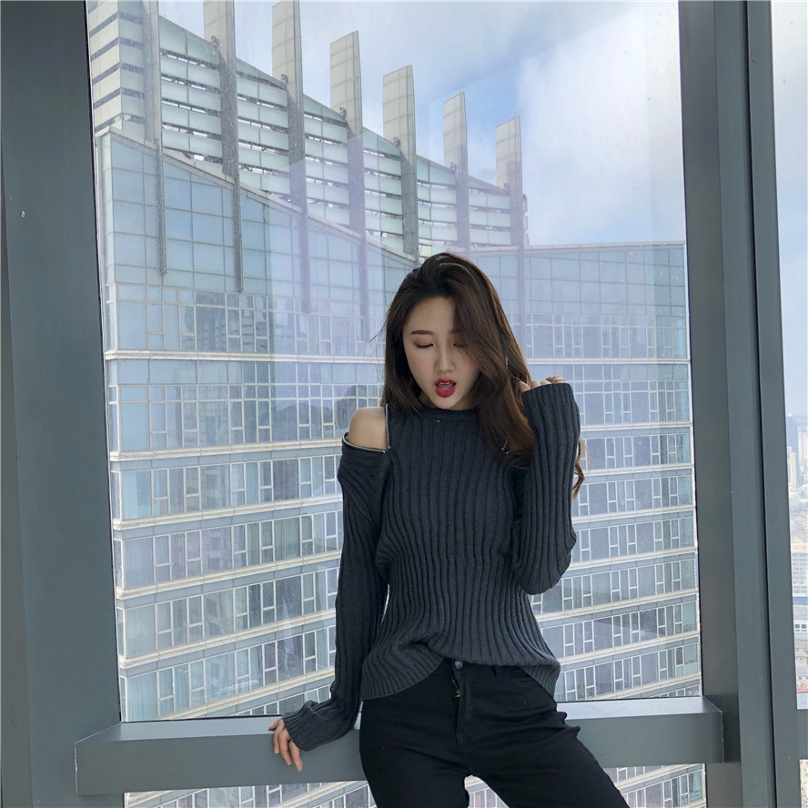 chic早秋毛衣慵懶2018新款女側拉鏈修身打底毛衣純色針織露肩上衣