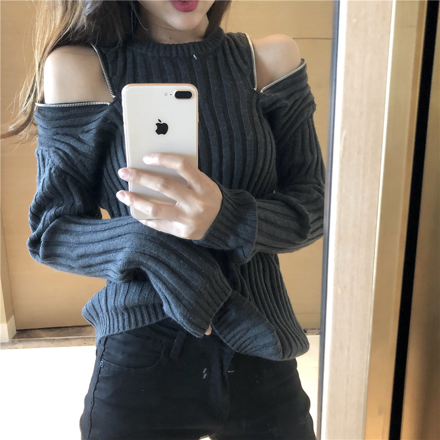 / chic早秋針織衫網紅露肩拉鏈毛衣秋裝女2018新款修身長袖針織上衣